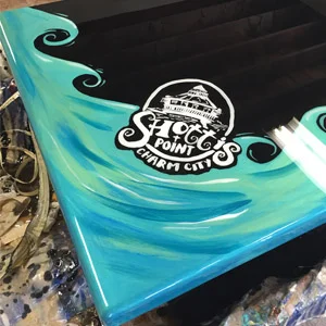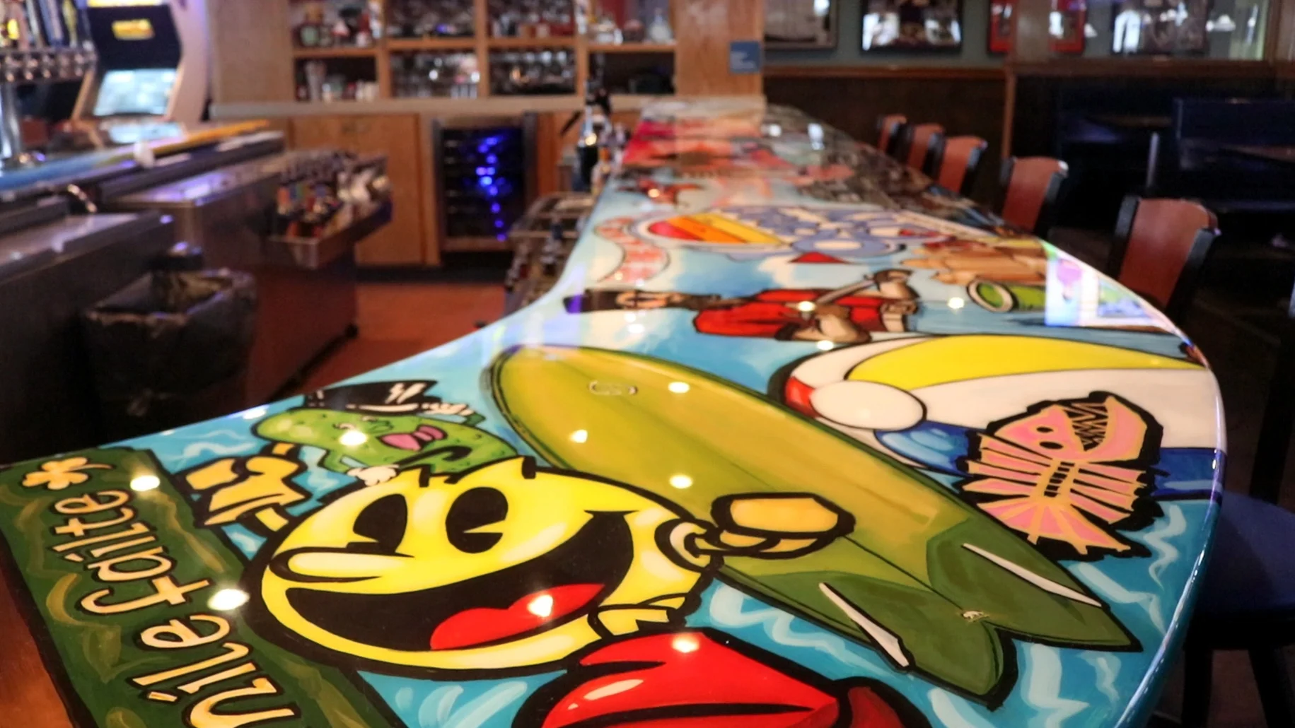 Hand painted bar top covered in a glass coat epoxy resin for the Crab Deck in Laurel, MD. This place is now closed.